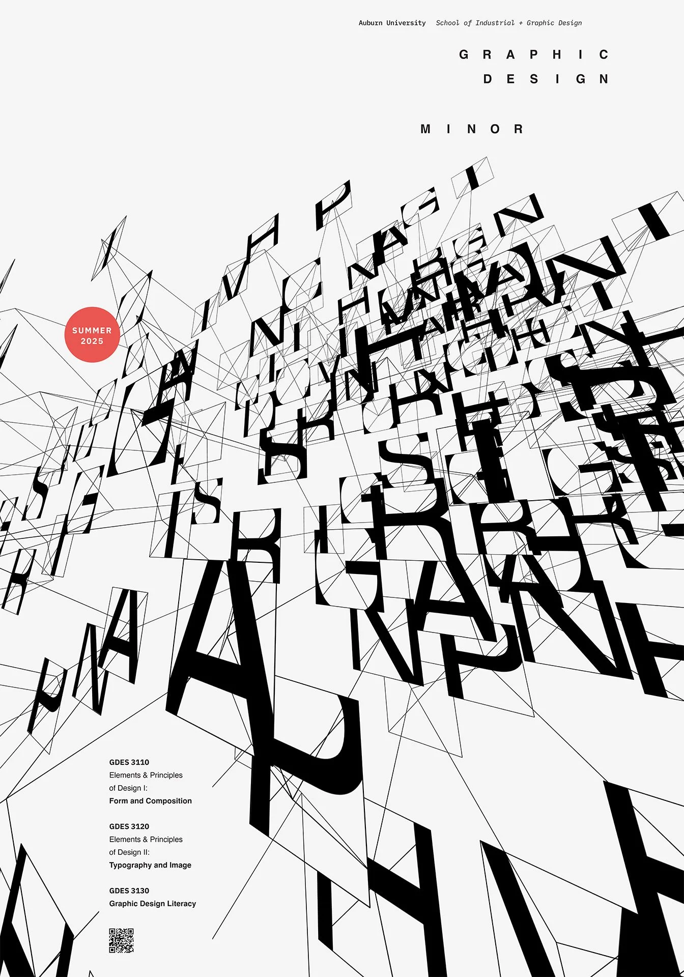 Project :: This poster promotes graphic design courses offered in the summer of 2025 in Auburn University's graphic design program. The classes are offered to students outside of the design program and, therefore, posted around campus to reach the intended audience, including art, marketing, business, and engineering students. The viewer can activate the poster animation by downloading the Artivive app and hovering the viewfinder over the printed poster.
